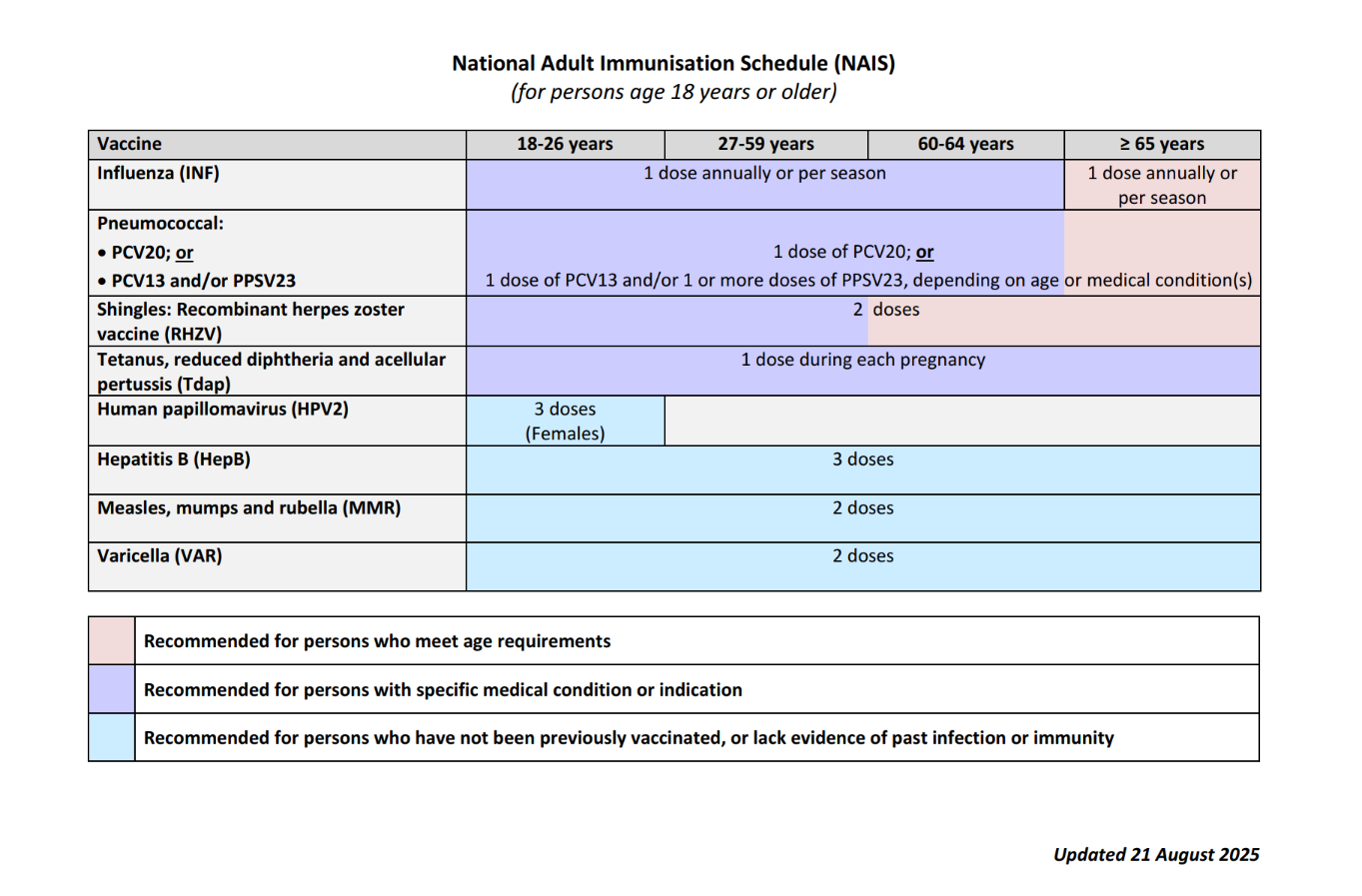 Certain adults are at increased risk of complications or susceptible to vaccine preventable diseases if they have not previously received the vaccination and are in contact with individuals who have the infection. Vaccinations recommended under the NAIS aim to prevent such infections among susceptible individuals and reduce complications, morbidity, and mortality.2